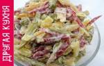 | Копченое мясо (курица, свинина, говядина) | 200-300 г | Нарезать кубиками или соломкой |