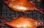 Рыба готовится так же, как и в предыдущем рецепте, только с коньяком добавляют ароматизированную консистенцию дыма в количестве 1 ст. л. В холодильной установке время маринования – двое суток. В момент приготовления на противень можно еще налить 1 ст. л. дымового ароматизатора. В духовке готовят тушки около двух часов.